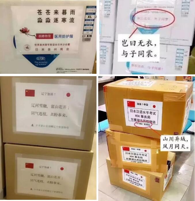 日本政府在疫情開始的第一時(shí)刻,就保證會(huì)幫助中國(guó)渡過難關(guān)。日本株式會(huì)社捐贈(zèng)了3300套防護(hù)服、6000雙鞋套、賦詞豈日無(wú)衣,與子同裳。富山縣向友好省縣遼寧省捐贈(zèng)了一萬(wàn)枚口罩,上面寫著:遼河雪融,富士花;同氣連枝,共盼春來。HSK事務(wù)所捐贈(zèng)了兩萬(wàn)枚口罩,上面寫著:山川異域,風(fēng)月同天。