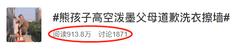 事情發(fā)生后,熊孩子的父母“兵分兩路”迅速補(bǔ)救:孩子?jì)寢寧е⒆影ぜ野羟瞄T道歉,并承諾把臟的衣服讓孩子手洗恢復(fù),孩子爸爸請(qǐng)高空作業(yè)的保潔公司幫忙恢復(fù)墻體,要求孩子一直站在太陽底下看著,直到清潔工人清潔完畢,方可離開。