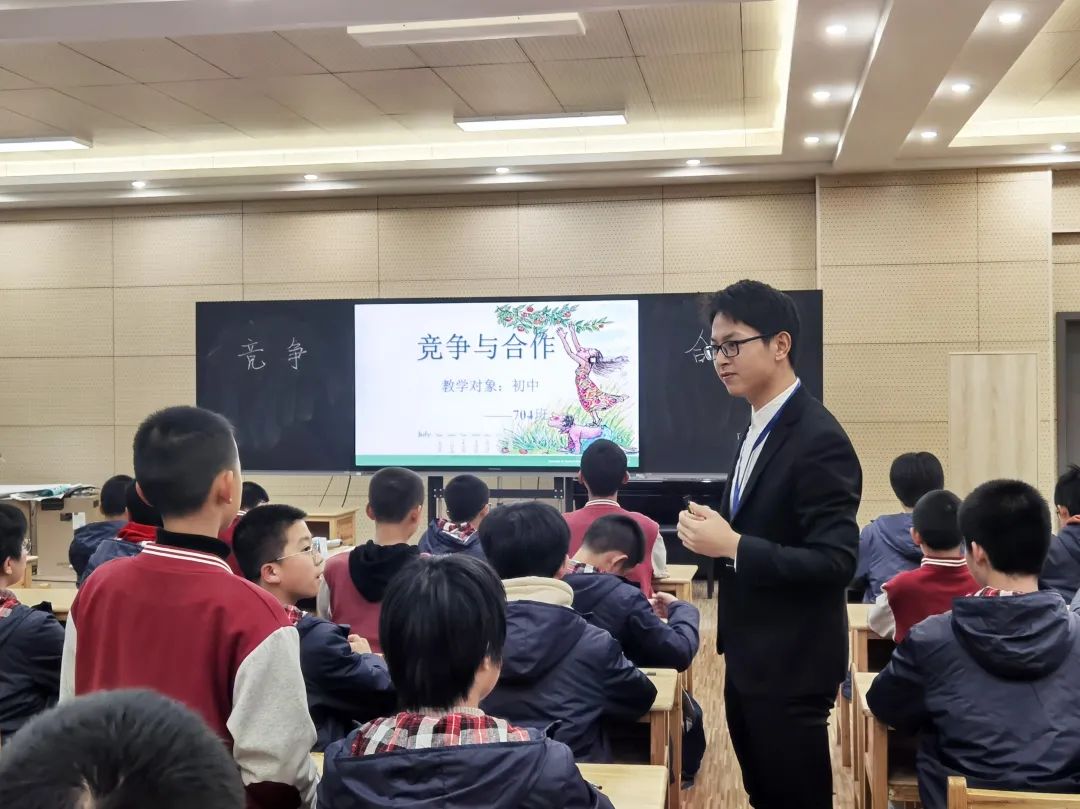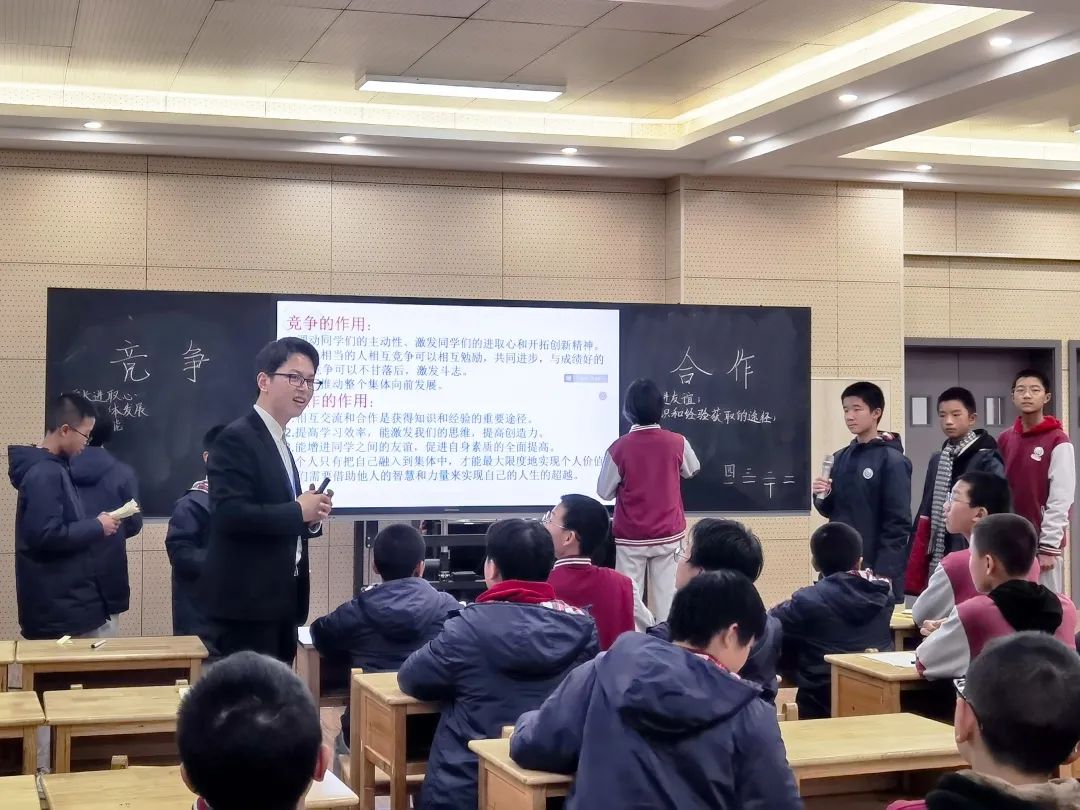 七六班班主任常雪晴老師和七四班班主任李金龍老師,實(shí)現(xiàn)了班會(huì)課的同題異構(gòu),都已《競(jìng)爭(zhēng)與合作》為主題,共同探討了競(jìng)爭(zhēng)與合作的關(guān)系。